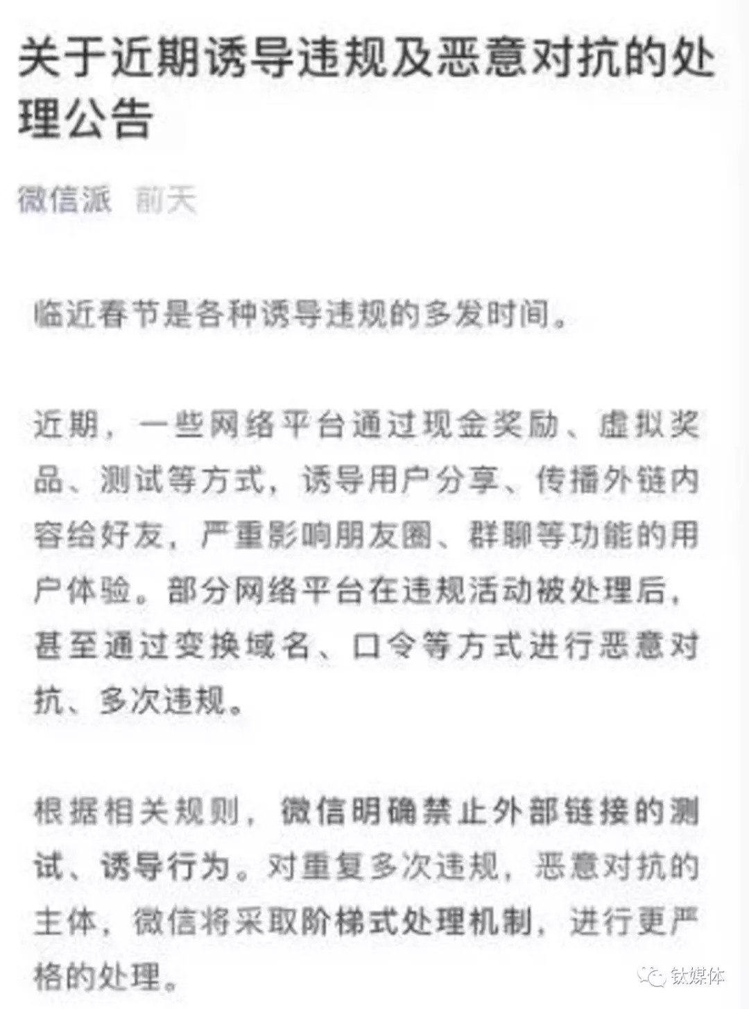 《公告》指出,此类行为严重影响朋友圈、群聊等功能的用户体验。根据相关规则,微信明确禁止外部链接的测试、诱导行为。对重复多次违规,恶意对抗的主体,微信将采取阶梯式处理机制,进行更严格的处理。