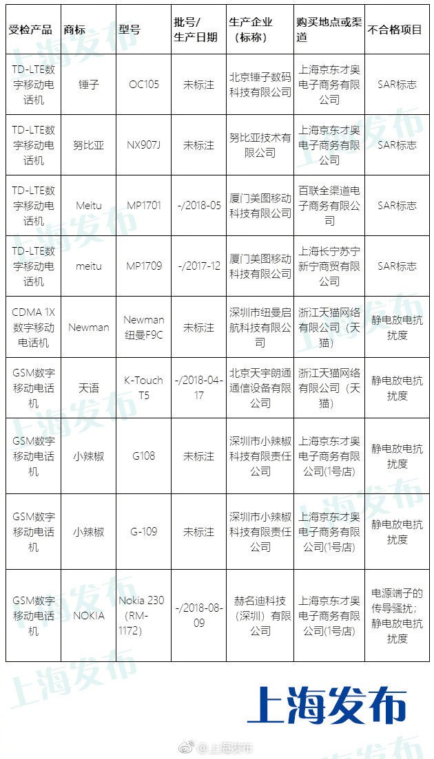 上海发布发文称,上海市场监管对上海市销售的手机产品质量进行了监督抽查,包含了32批次手机产品和20批次老年人手机产品。经检验,手机产品不合格4批次,老年人手机产品不合格5批次。不合格项目为SAR标志、电源端子的传导骚扰和静电放电抗扰度等。涉及手机品牌包括锤子、努比亚、美图等。