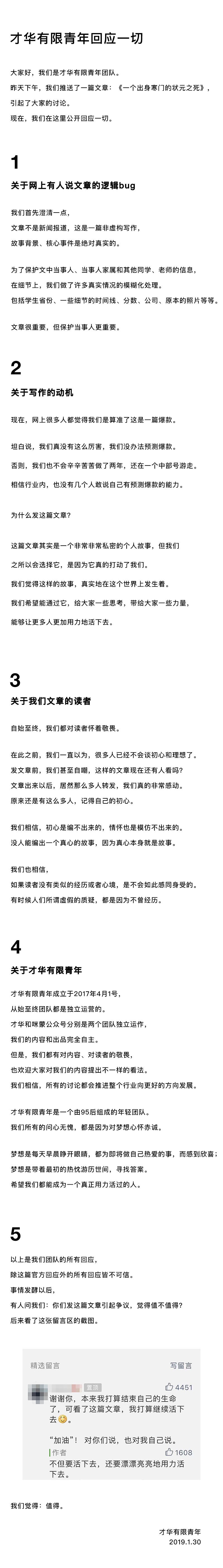 “才华有限青年”团队回应“寒门状元”热议称,这是真实故事,文章是非虚构写作,文章写的“值得”。此前,《一个出身寒门的状元之死》文章成为网络热议的焦点,获得“10W+”的阅读量。随后,这篇文章被微信屏蔽。
