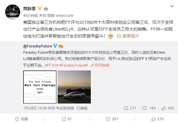 贾跃亭今日在转发微博时表示,“美国独立第三方机构把FF评为2019加州十大高科技创业公司第三名,仅次于全球出行产业突出者Uber和Lyft,这种认可是对FF全体员工极大的鼓舞。FF将一如既往地为打造共享智能出行生态的愿景而奋斗!”