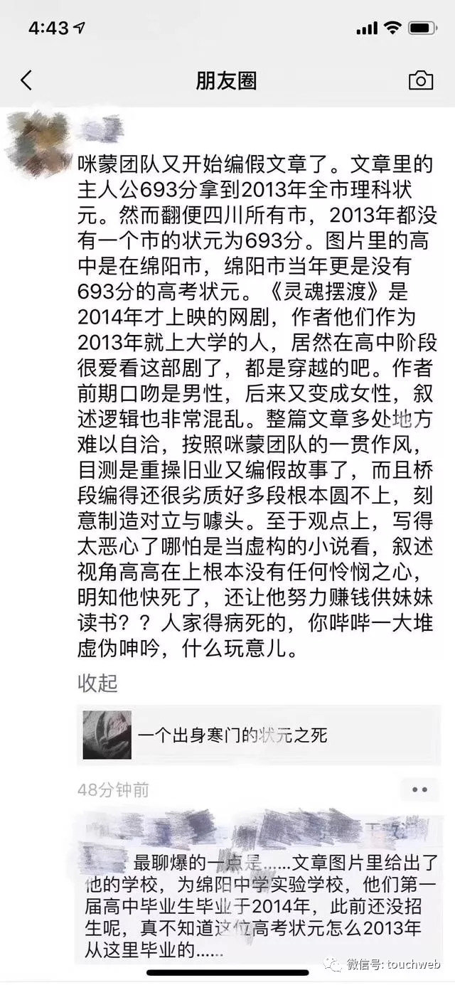 腾讯公关部相关负责人表示,《寒门状元之死》被删原因系“此内容因违规无法查看”,此外,腾讯接相关投诉,该内容违反《即时通信工具公众信息服务发展管理暂行规定》,发布账号已被禁言60天。