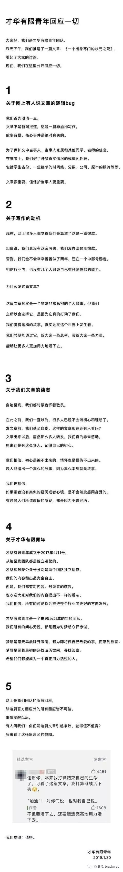 今日,《一个出身寒门的状元之死》的作者、自媒体账号“才华有限青年”做出回应,称文章不是新闻报道,这是一篇非虚构写作,但故事背景、核心事件是绝对真实的。