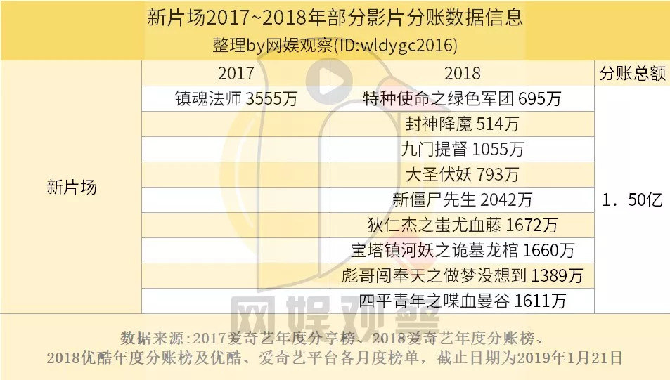 2018年爱奇艺、优酷top20分账榜上,新片场有8部作品上榜,分账总额高达9820万,仅一年就达到了近一亿分账,成了2018年网大市场中最为璀璨的新星。