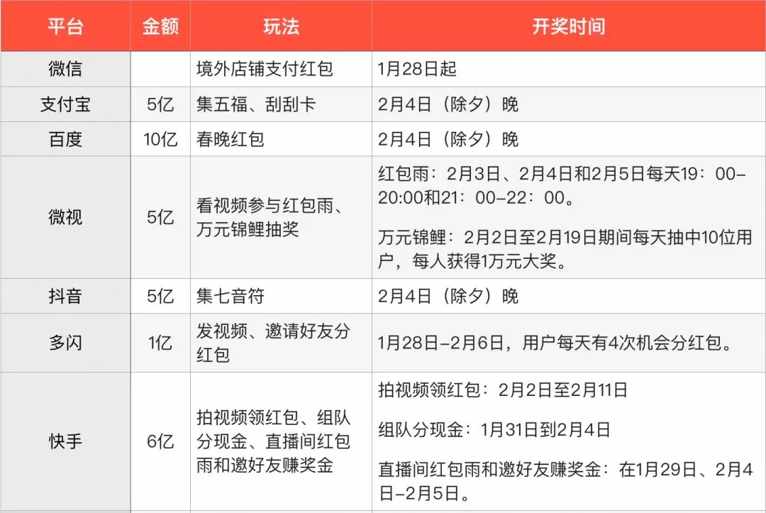最后,我们把各大平台发红包的总金额和开奖时间给大家列个表,有需要的对号入座哟~