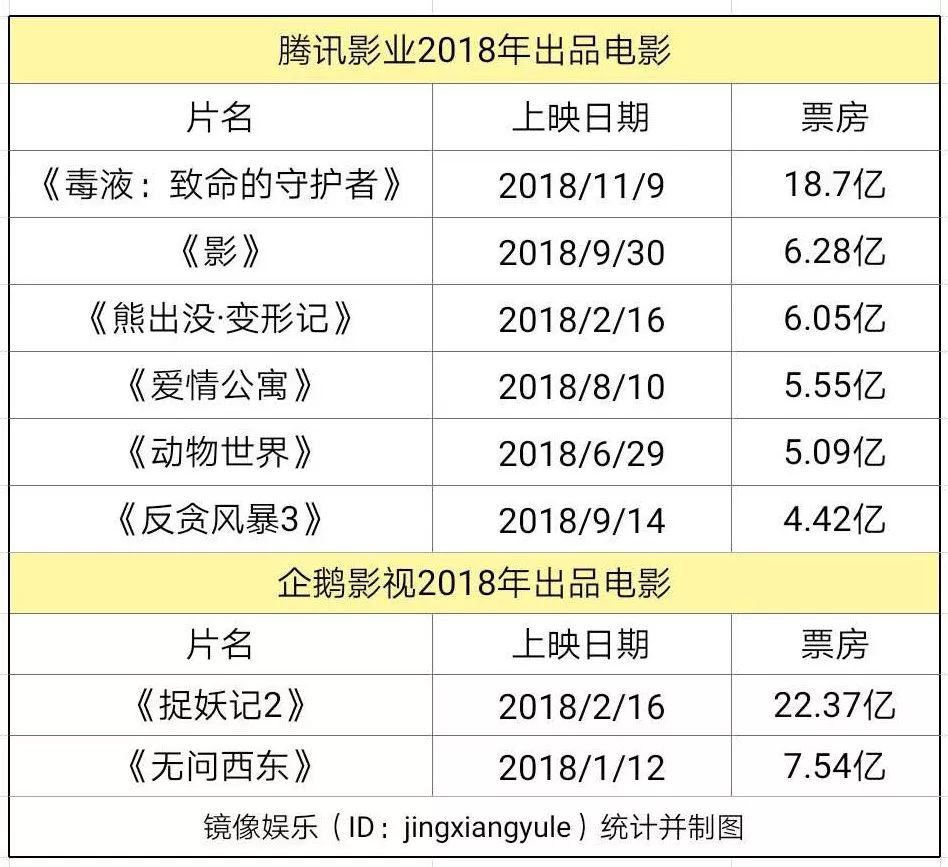 2018年,腾讯影业有成长,也有不俗的成绩。年初参与中国区推广的《头号玩家》口碑、票房双收,但在暑期档,《爱情公寓》与《盗墓笔记》双IP结合的探索不为受众广泛接受。而从国庆档的《影》开始,加上随后的《毒液》《海王》等项目,逐渐展示出腾讯影业过去的积累终有所成效。另一边,企鹅影视参与出品的《捉妖记2》口碑虽较前作有所下滑,但收获了22亿票房。