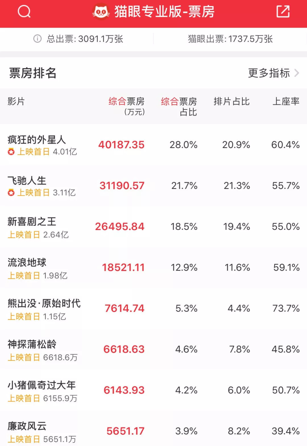 截止目前,大年初一的票房已达14亿,春节档四部影片《疯狂的外星人》《飞驰人生》《新喜剧之王》《流浪地球》均在上映首日突破了亿元大关,可见国民观影热情比去年的势头有增无减。
