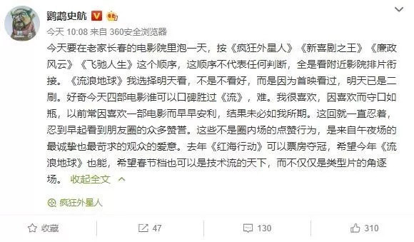 《流浪地球》开局排片、票房均位列第四的排名,很难不令人联想到去年春节档的“黑马”《红海行动》,其凭借超强口碑实现排片、上座率双双逆袭夺得票房冠军的战绩,至今依然被很多人津津乐道。而《流浪地球》早在此前,就有不少人基于影片“好片不怕看”的质量,做出了类似的大胆预测。