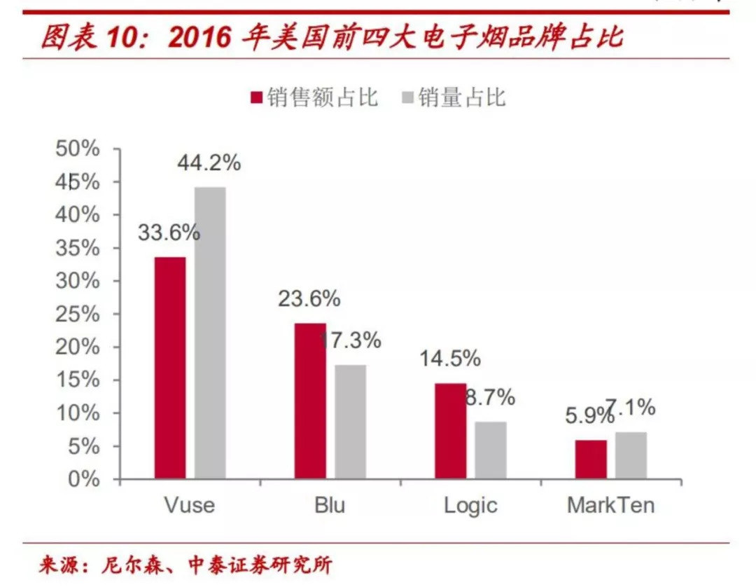钛媒体还在中泰证券研究所发布的一份报告中看到这组数据(下图):在美国,2016年度前四大电子烟品牌均出自传统烟草巨头,而近两年后来居上的Juul也近期接受了奥驰亚的入资,后者入股35%。