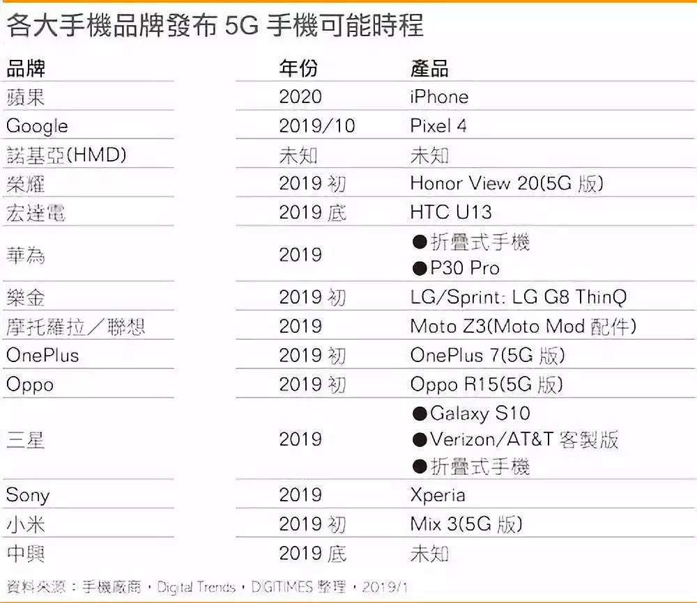 近日有媒体公布了一份5G手机发布时间表,从2019年初到2020年,排名前十的手机厂商的5G产品将会迎来密集发布。2019年,将会有十多款5G手机陆续发布。
