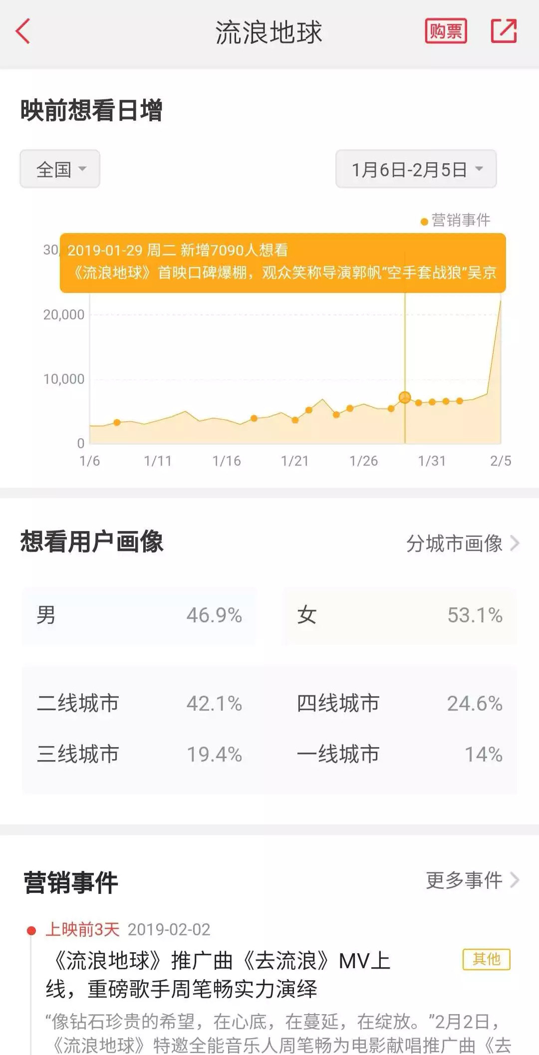 通过这个阶段的营销,《流浪地球》想看观众的男女比例由最初73%:27%,到现在的46.9%:53.1%,女性观众反超男性观众,说明通过宣传成功使观众接受了这部硬科幻电影的软核心。