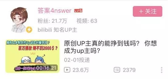 春节之前,B站UP主“答案4nswer”在B站发布了一个视频《原创UP主真的能挣到钱吗?你想成为UP主吗?》,视频中他以个人观点谈了谈作为B站原创UP主,他感受到的UP主的处境与通过内容创作获得的收入,最后的落点并不是理想主义的乐观呼吁,而是现实面的考量。