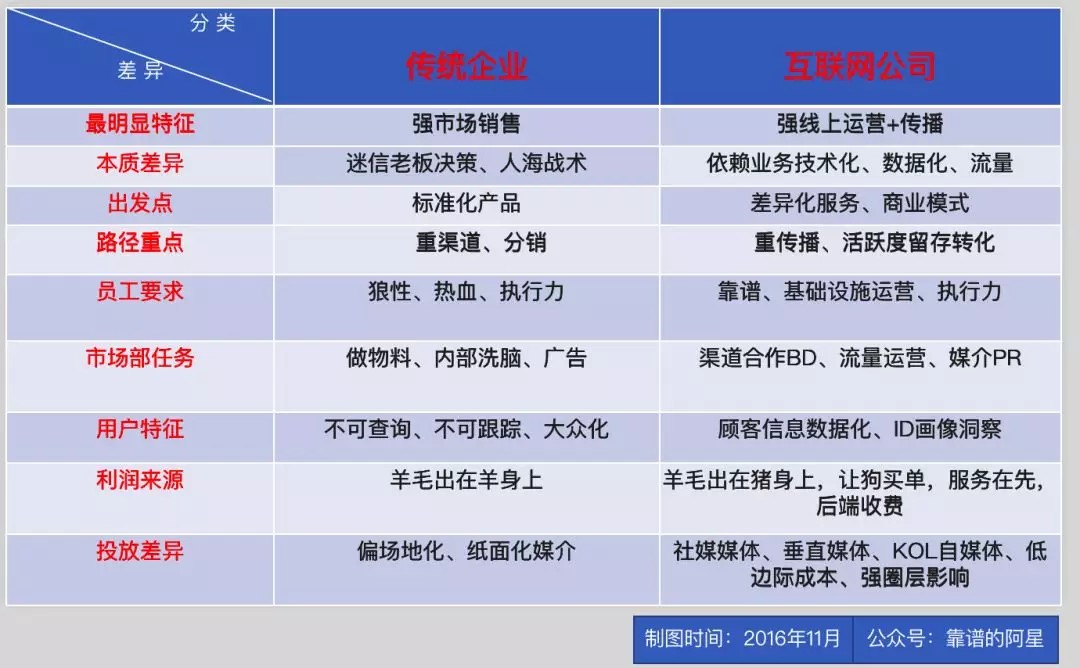 阿星在传统企业与互联网公司都待过,觉得二者之间思维模式以及商业逻辑还是有本质差异的。一起来看看这张图:
