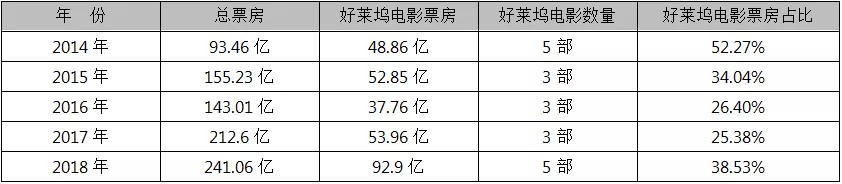 2014~2018年“年度票房排行榜前十名”好莱坞电影票房占比统计表
