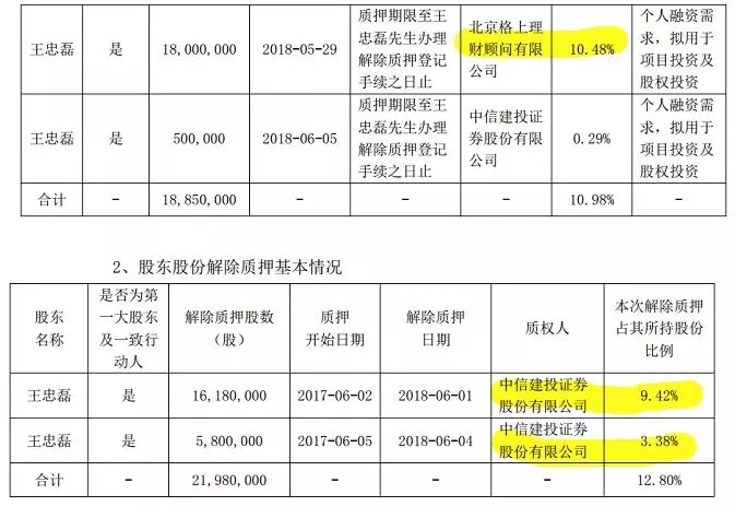 最大的质押方是华谊IPO和几次定增的保荐机构中信建投。华谊与中信建投的关系非常密切,甚至后者还与阿里创投、平安资管、腾讯一起认购了华谊2015年的定增。而值得注意的是,就在2018年6月,王中军和王中磊突然进行大额解质押和质押。当时,华谊经历了一轮猛烈的舆论攻击。而仔细查看当时的质押细节,有一个操作很有意思:王氏兄弟向北京格上理财质押融资,来替换之前向中信建投的质押融资。