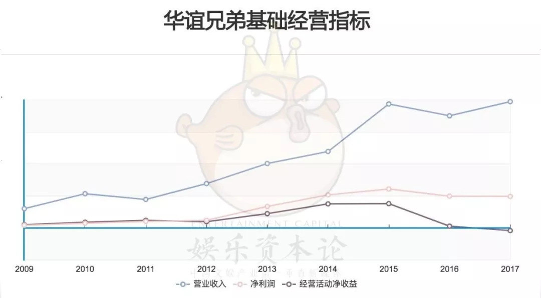 业务重心的调整直接反映在了营收上,华谊兄弟没能跟上整个影视行业那几年的高速发展。在此后几年间,不断抛售游戏公司股票获得的投资收益甚至还承担了“遮羞布”的作用——核心利润增幅持续下滑,主营业务营收两次下滑、2016年一度出现亏损,盈利靠投资。