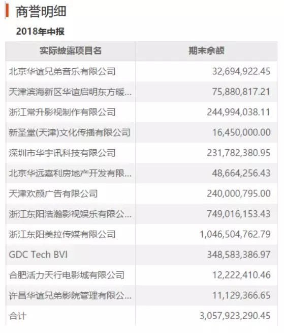 然而,2018年业绩预告中近10亿的亏损,依然震惊市场。这是华谊上市以来首次的净利润亏损,前几年连续多起颇具争议的并购案积累了30多亿的商誉,犹如一头黑犀牛,终于要让上市公司付出延迟的代价。