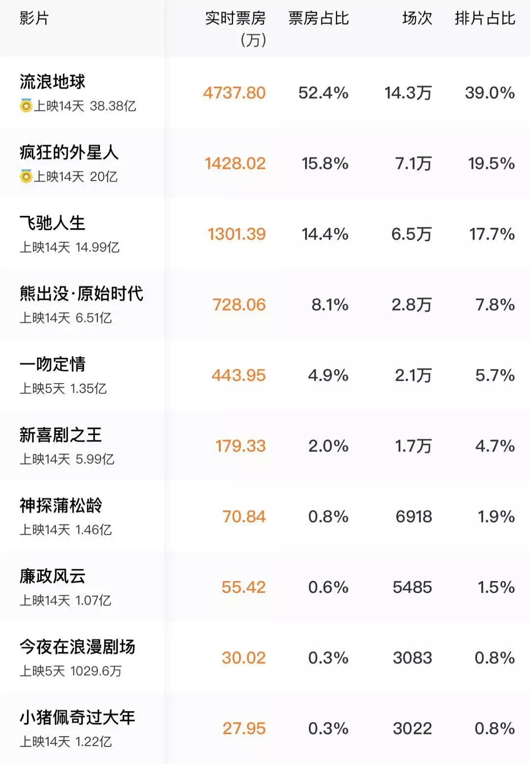 2019年2月10日,国家电影局公布了春节档电影的初步统计数据:今年春节假期,中国电影票房达58.4亿元,观影人次达1.3亿。此前大热门《新喜剧之王》意外跌出三甲,仅以5.32亿元票房排至第四,落后20.1亿元的《流浪地球》、14.49亿元的《疯狂的外星人》,甚至是第三名的《飞驰人生》一半多一点,被前三甲远远抛在身后。