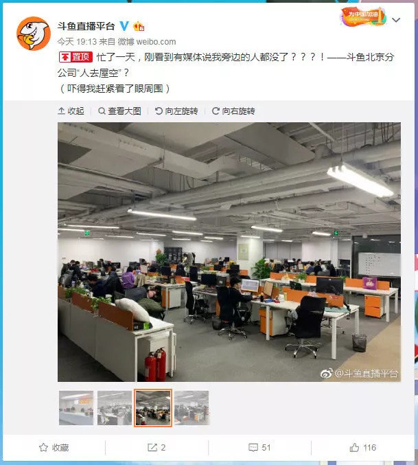 据悉,武汉斗鱼网络科技有限公司近期发生变更,湖北长江招银成长股权投资合伙企业、新余金诚实业集团有限公司、深圳市招银共赢股权投资合伙企业退出股东行列,三家公司将斗鱼5.368%股份转让给其CEO陈少杰,使其成斗鱼最大股东。另外,据接近斗鱼高层人士透露,斗鱼确定赴美IPO。2月18日,记者发现斗鱼北京分公司所在的优盛大厦7层,多个办公室已人去屋空,员工寥寥无几。2月19日晚间,斗鱼通过其官方微博否认北京公司“人去屋空”传闻。