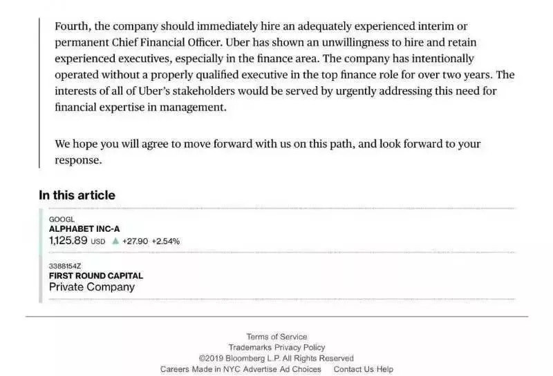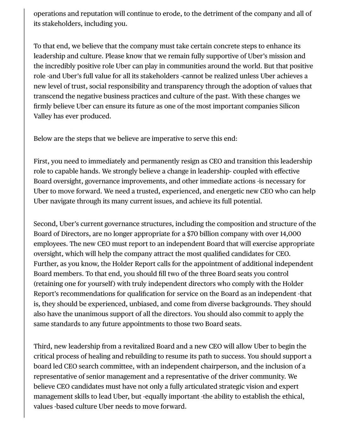 这封代表机构投资者意见的信明确提出了四个要求:卡拉尼克辞职;重建Uber的公司治理架构,聘请真正的独立董事;由新的团队把公司重新带入成功的正道,不只关注增长和底线,还要关注透明、多元化和社会责任;立即聘请合适的CFO。