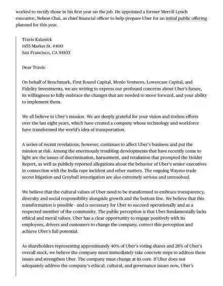 我推荐朱啸虎的观点,是因为不久前看到他在朋友圈分享了2017年6月Uber的机构投资人向创始人卡拉尼克(Travis Kalanick)提交的一封信。这封信的背景是当时Uber所遭遇的一系列公共危机,包括公司的性别歧视、性骚扰、Uber司机在印度的强奸案风波、非法获得谷歌母公司旗下自动驾驶业务Wayno的技术资料、用“猫和老鼠”的方法阻止监管机构的调查,等等。