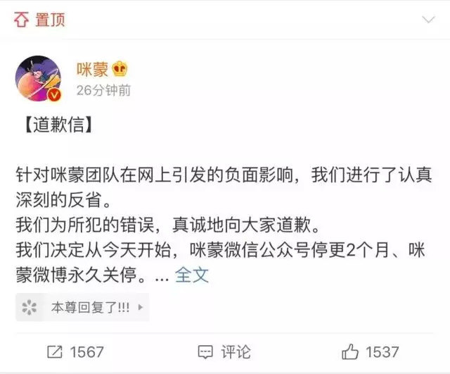最终,咪蒙对外致歉,并且关闭了其个人微博,并对公众号做出停更两个月进行整改的决定。
