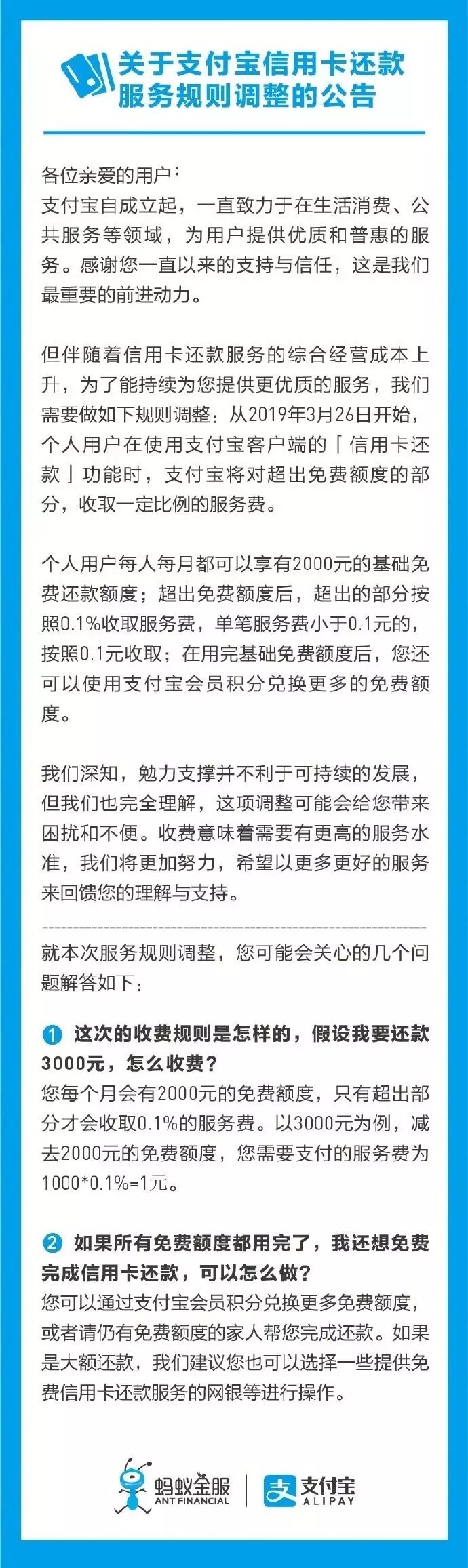 支付宝还信用卡下月开始收费,每月2000元免费额度