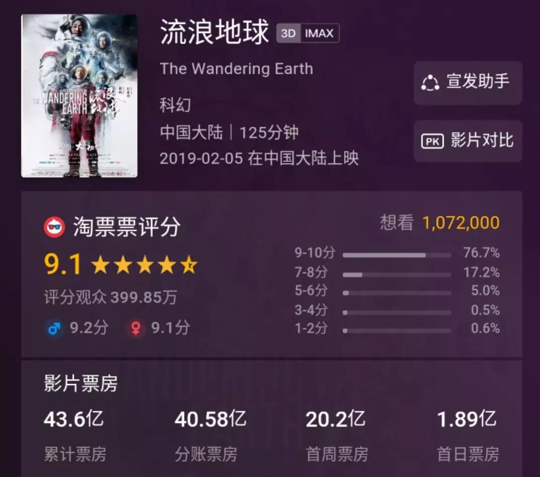《流浪地球》成为中国内地票房的亚军,也是继《战狼2》后又一部超现象级影片。从不同角度来说,他都是是目前中国科幻电影的标杆,甚至在北美小范围放映导致的一票难求,Netflix也率先宣布其获得了该片除中国内地之外的全球流媒体播放权。