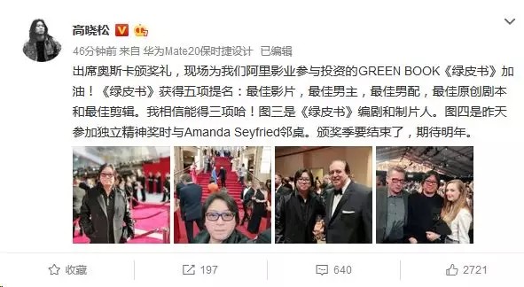 在提名名单中还有中国电影公司的身影。获得今年奥斯卡5项提名的《绿皮书》由阿里巴巴影业联合出品,值得一提的是,该片最终斩获最佳影片、最佳男配角、最佳原创剧本3项大奖。有意思的是,此前高晓松在为《绿皮书》“摇旗呐喊”之时,就曾猜测该片将获得3项大奖。