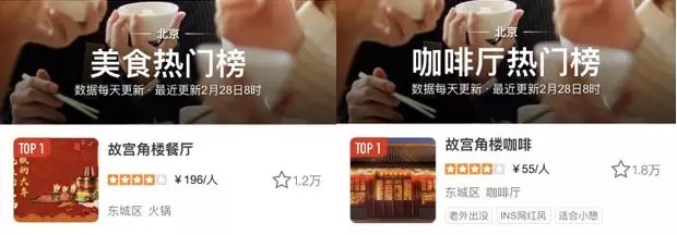 经过一圈爆发式传播,目前,故宫角楼餐厅和故宫角楼咖啡已分别是北京美食热门榜第一名和北京咖啡厅热门榜第一名。