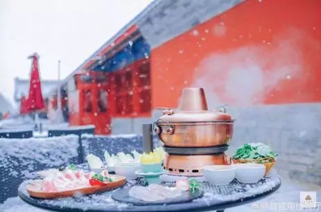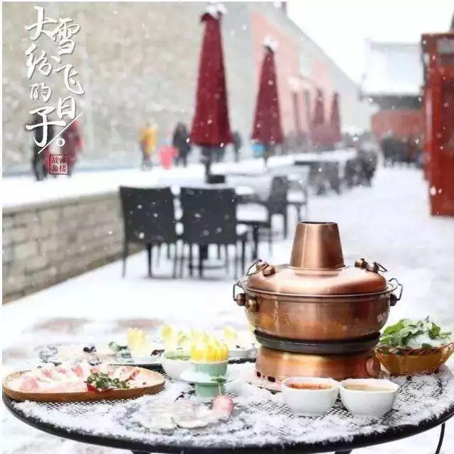 白雪镶红墙,琼脂坠未央。烟霞蒸紫气,十里火锅香。
