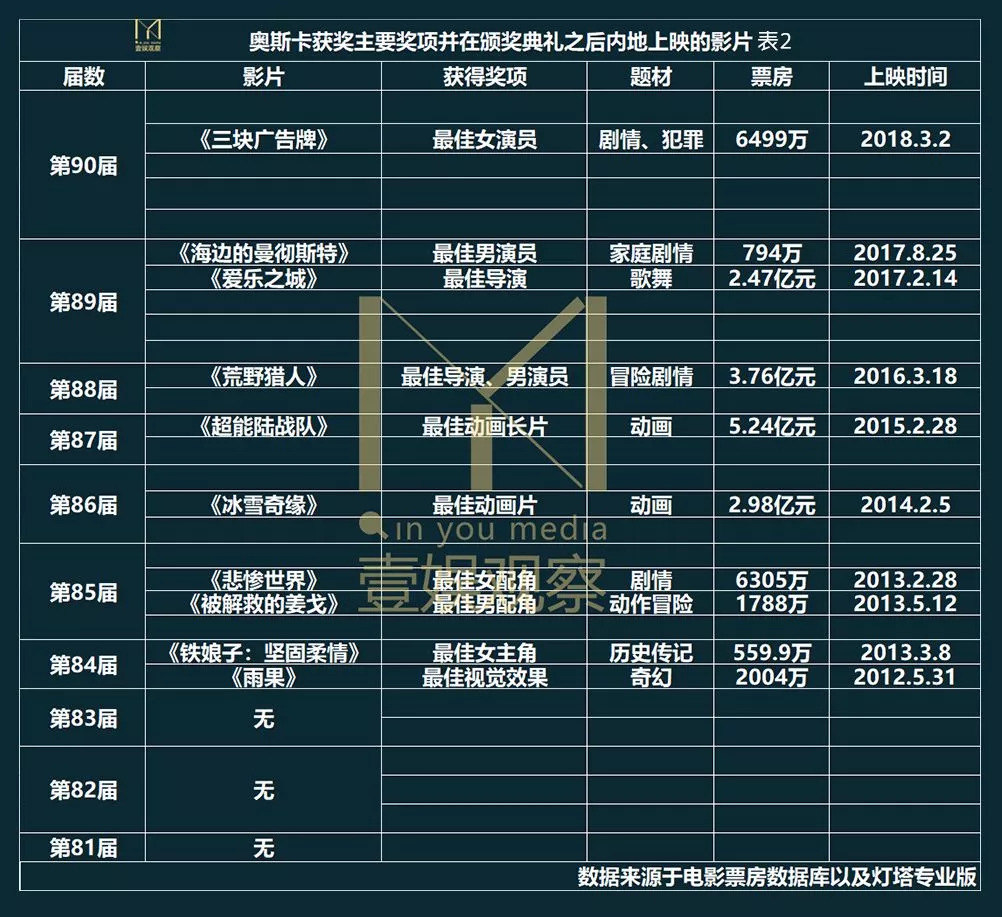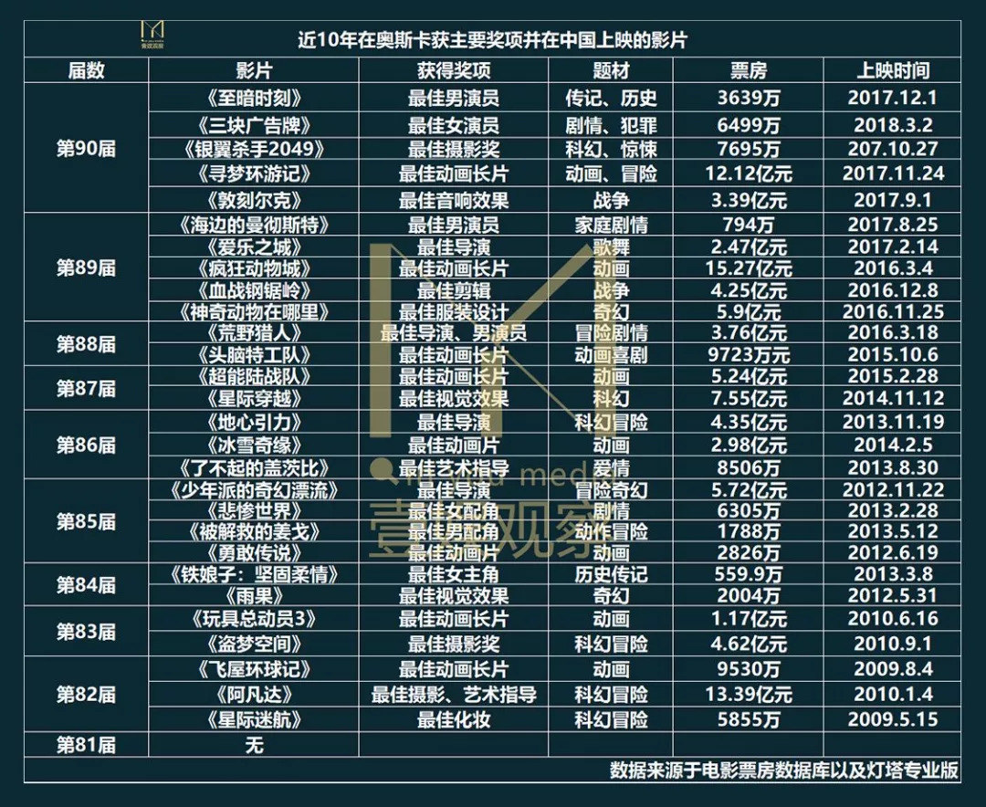 在这里需要注意的是,以上是全部奥斯卡获主要奖项并在内地成功上映的影片。影片上映时间是否在奥斯卡颁奖典礼周期,并未细分。其中包括在奥斯卡奖之前、正在、之后上映的所有影片。