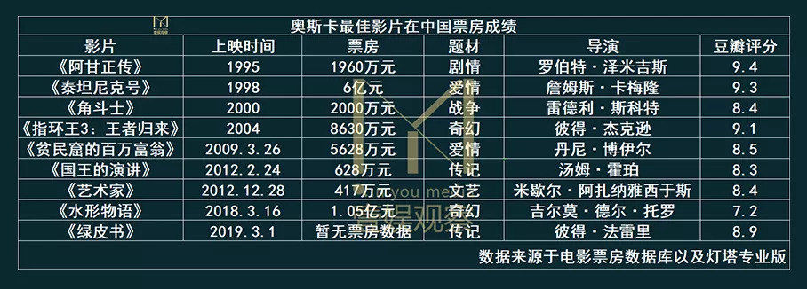 自1994年内地开始以票房分账的形式引进海外影片算起,至今已有25年时间,壹娱观察(ID:yiyuguancha)综合电影票房数据库和灯塔专业版相关统计,在这25年间获得奥斯卡最佳影片一奖,且在中国上映的影片有《阿甘正传》《泰坦尼克号》《角斗士》《指环王3:王者无敌》《贫民窟的百万富翁》《国王的演讲》《艺术家》《水形物语》以及《绿皮书》,共有9部,占这25届奥斯卡最佳影片总数的36%。
