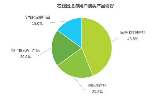 有一项关于在线出境游用户购买偏好的调查显示,有43.8%的用户选择标准化打包产品,即传统的跟团游产品,占比不到一半。其余的,有20.0%的用户选择纯“机+酒”产品,有21.2%的用户选择单品类产品,即自由行产品,有15.0%的用户选择的是个性化定制产品。