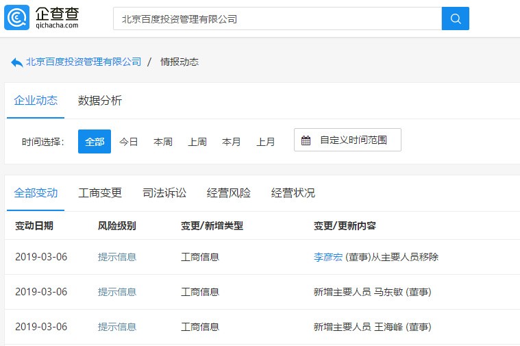 企查查数据显示,北京百度投资管理有限公司发生工商信息变更,李彦宏卸任董事,马东敏、王海峰成为新任董事。
