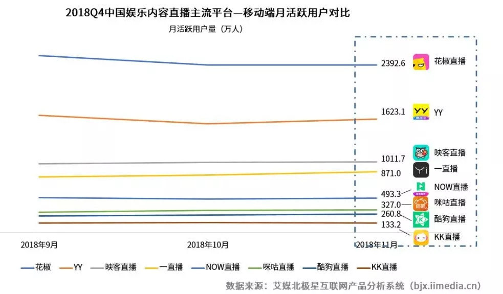 娱乐内容类直播平台中,花椒直播2018年Q4以2392万的月活跃用户量稳居第一。YY直播处于第二梯队,映客直播、一直播、NOW直播、咪咕直播等则在第三梯队。随着虎牙和斗鱼相继发力泛娱乐直播,娱乐内容类直播平台的格局或许还将发生变化,尾部的咪咕直播、酷狗直播、KK直播等或面临被淘汰的危机。