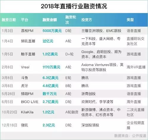 2017年,直播行业融资事件共25起,2018年,整个行业融资事件仅10起,由此不难发现直播行业的“失宠”。为了不被时代大潮流抛弃,2018年各大直播平台的资本动作也很是频繁,虎牙与映客率先上市;花椒直播与宋城演艺子公司6间房重组;陌陌直播业务面临瓶颈下,收购了探探为其导流。