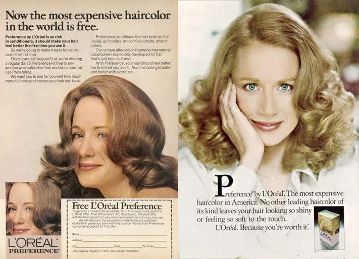 从“她染了还是没染”,到“因为我值得拥有”,染发广告的演进,表面上是化妆品公司之间的商战案例,本质上是美国中产女性社会地位的变迁。美国女权运动的第二次浪潮(1960-1980年代)的所取得的成果,就隐藏在伊卡璐和欧莱雅这两张简单的染发广告里。