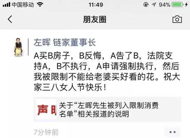 “A买B房子,B反悔,A告了B,法院支持A,B不执行,A申请强制执行,然后我被限制不能给老婆买好看的花。祝大家三八女人节快乐!”3月8日,针对被法院列为限制消费名单一事,链家实际控制人左晖在朋友圈回应。