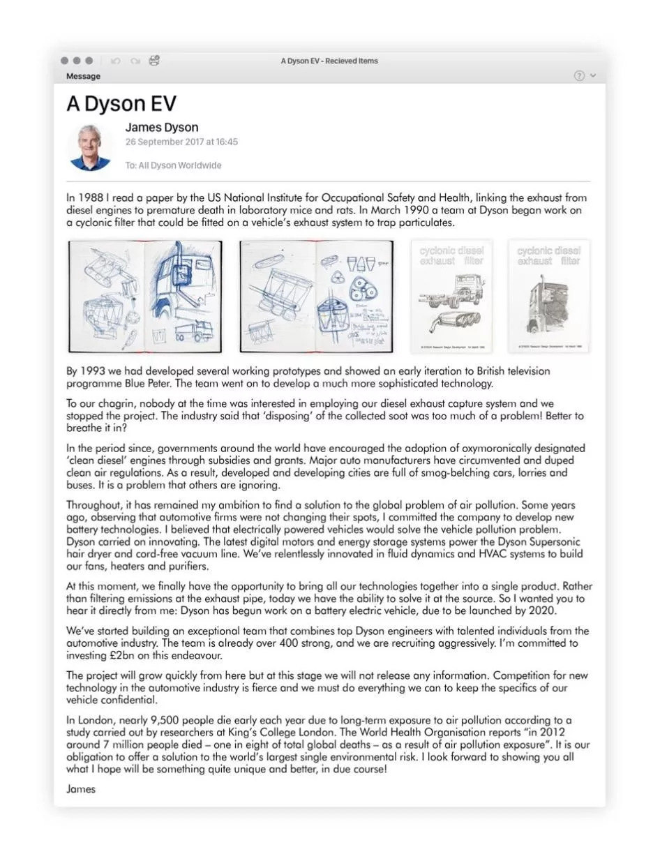 时机未成熟时,公司没有承认这一计划,直到2017年9月26日,戴森的一封信解密了造车项目。