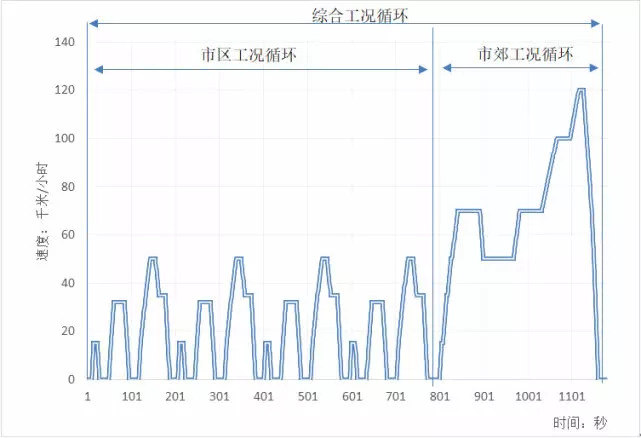 NEDC的测试方法,就是在实验室内,将车辆放在滚筒台架上进行测试,通过和轮胎接触的滚筒带有电机用来模拟不同工况下的阻力,通过鼓风机来模拟当前车速下相符的气流。NEDC循环工况中包含4个市区循环和1个郊区循环:值得一提的是在NEDC的测试中,测试时所有其余负载(空调,大灯,加热座椅等)都会关闭。