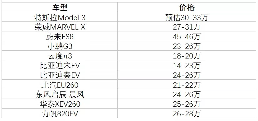 特斯拉与国产电动汽车价格(官方指导价格)表一览