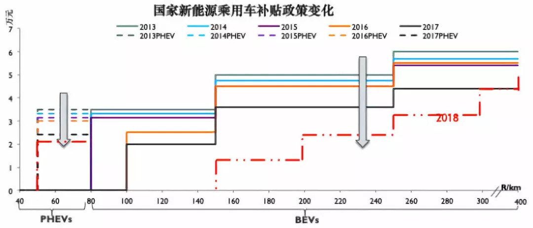 中国新能源汽车的发展离不开国家补贴政策的扶持,为了鼓励中国新能源汽车产业的发展,国家自2010年从试点开始推出补贴政策,并在2013-2015年达到顶峰,随后几年里补贴逐步退坡,并调整补贴侧重方向,以鼓励产业技术升级,为市场化做铺垫。如2018年为了鼓励高续航产品和高能量密度电池的研发,彻底取消低150km以下续航的车型补贴,并加大了高续航车型的补贴力度。