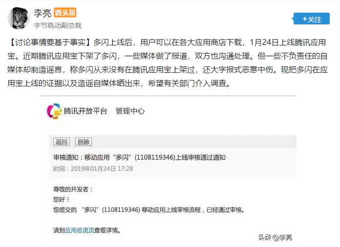 字节跳动李亮否认“多闪”从未出现在应用宝