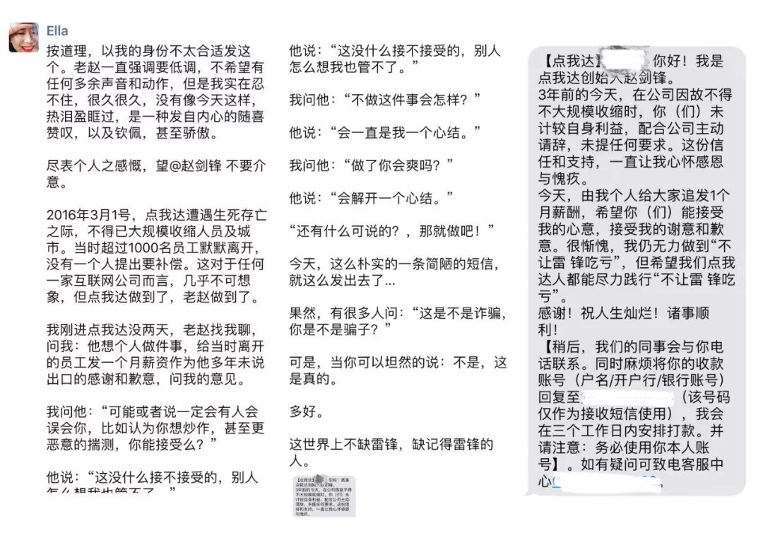你好,我是点我达创始人赵剑锋。3年前的今天,在公司因故不得大规模收缩时,你(们)未计较自身利益,配合公司主动请辞,未提任何要求。这份信任和支持,一直让我心怀感恩与愧疚。