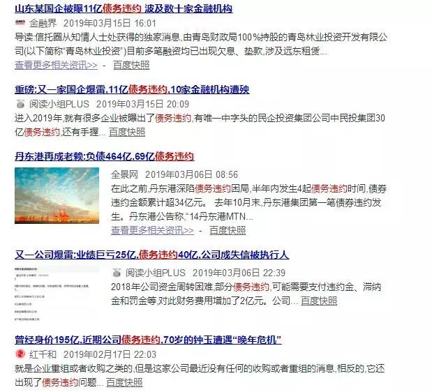 债务高企的另一含义就是债务违约潮的到来。2019年,各种金融债券将大量到期,偿还总量将超过6万亿,比上一年增加15%,创历史新高。我们只要上新闻搜索引擎搜索相关讯息,会看到一连串的债务违约新闻。出现“债务爆雷”的企业从国企到民企,涵盖行业从土地开发到娱乐传媒。股市的高歌猛进和债务违约的现实呈现出强烈的矛盾。