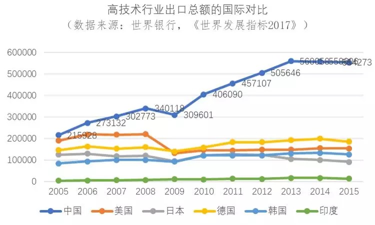 2015年,中国高技术产业主营业务收入突破了13万亿元人民币,占制造业比重达到14.1%。同时,高技术行业出口总额占制造业出口的比达到了25.8%。从国际对比来看,中国高技术制造业的出口额也要远远高于世界其他国家和地区。