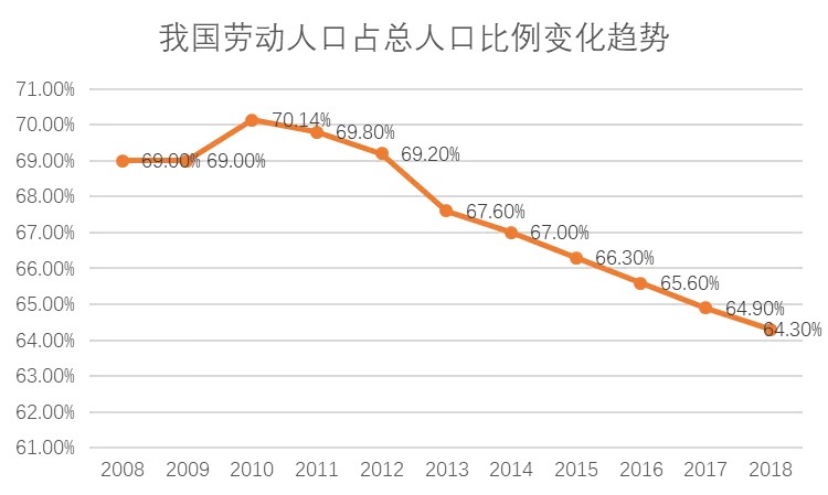 第二个影响是劳动人口比重的降低。目前我国16至59周岁的劳动年龄人口89729万人,占总人口的比重为64.3%。据国家统计局统计数据,自2012年起,我国劳动年龄人口的数量和比重连续7年出现下降,7年间减少了2600余万人。受劳动年龄人口持续减少的影响,劳动力供给总量下降,2018年末全国就业人员总量也首次出现下降,预计今后几年还将继续下降。