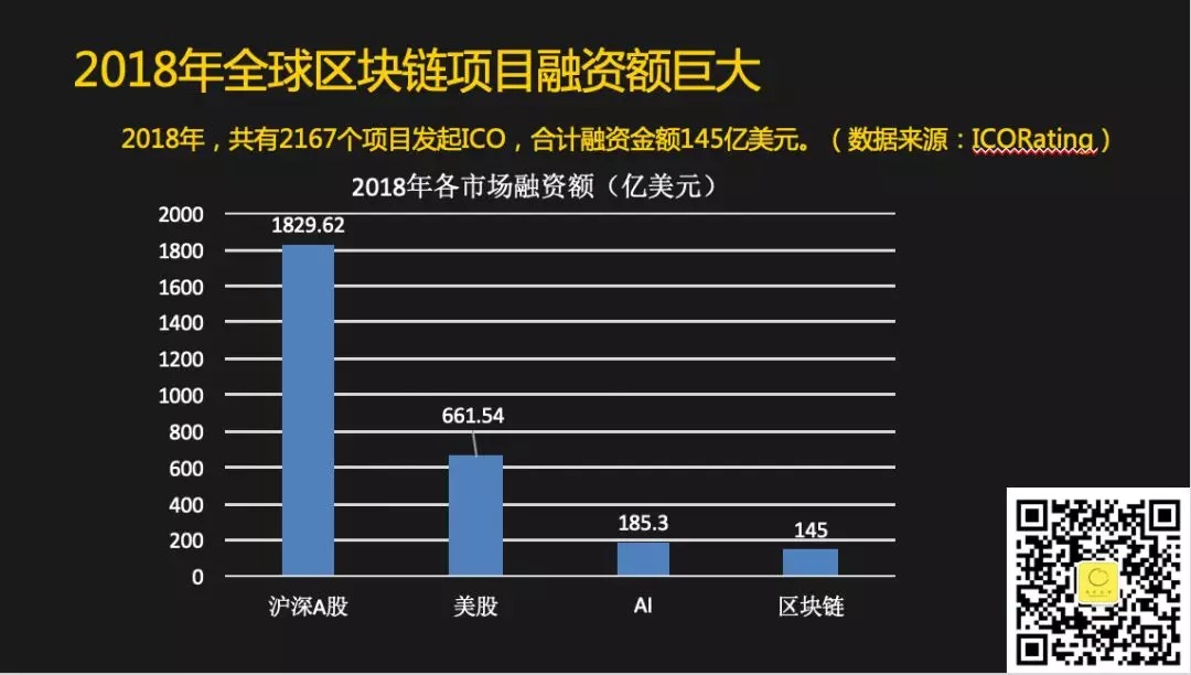 刚才我提到,AI是2017年开始爆发的。2018年开始,区块链得到了爆发性增长,融资额达到145亿美元。同年的AI直接融资额是185亿美元,将来完全可能被区块链反超。