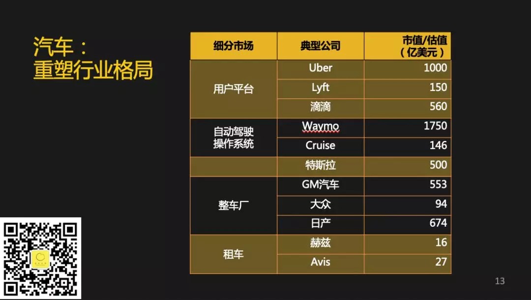 大家可以比较以上公司的市值,最大的整车厂如通用大众、日产,也就是五六百亿美金,现在滴滴、Uber、Waymo的市值/估值都远超他们。