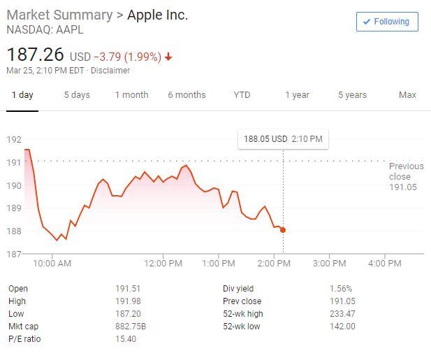 苹果2019年春季发布会时长1小时50分钟,结束时苹果股价跌1.7%。最终苹果收跌1.2%,报收188.74美元,创3月20日以来最低,盘后微涨。